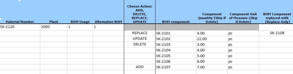 * REPLACE will find the existing component and let you swap to a new component, along with updating qty and uom