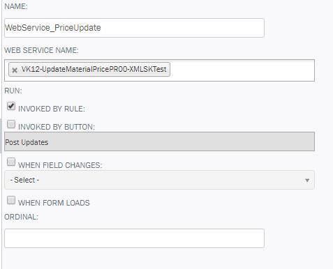- In place of our custom JavaScript event handler, onExecuteSoldToPricingGroup(), is the following correct to bind our Execute button to post the Pricing changes to our Web Service? Again, I am assuming what you shared in your reply for binding the button to call the Web Service is specific to Winshuttle Composer Version 12. I am hoping that you can tell me if the same steps that follow would provide the same functionality in calling the Web Service in our Form Solution using Winshuttle Composer Version 11.