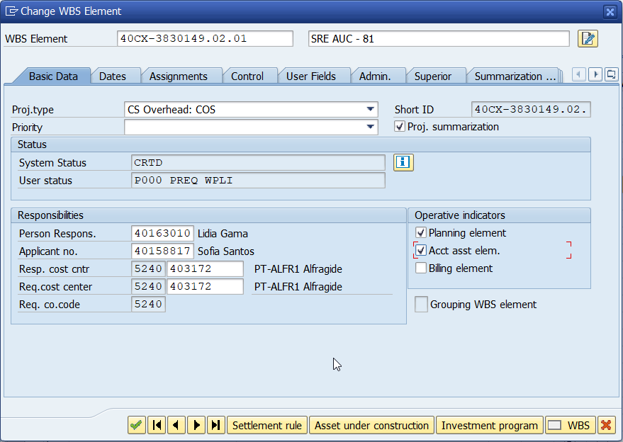 I'm changing a wbs element after creating the basic structure. My 3rd level lines should have the account assignment element and planning element selected (operative indicators) as per image:
