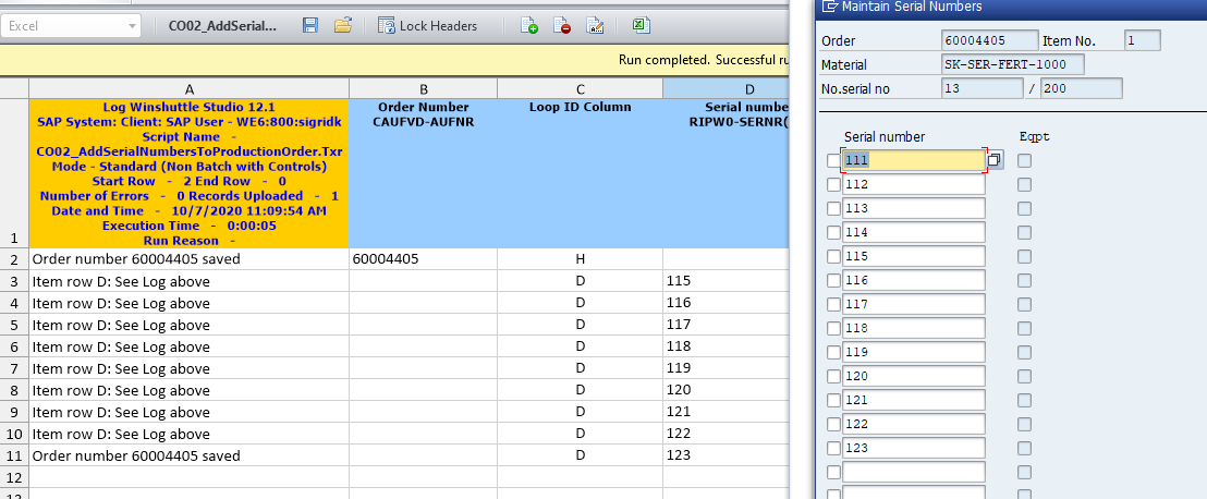 I am trying to create a script for inserting serial numbers on a multipiece production order via CO02. In the script recording, I get to the serial entry window and winShuttle records as follows: