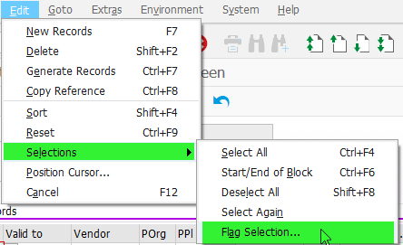 In ME01...Edit>Selections>Flag Selection