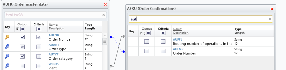 I have one more request for you. I've successfully gotten meaningful output with the fields listed in the screenshots, defining plant number and a range of dates. (Tables used: AFRU, AFIH, PLPO and QMEL). My admin has only given me scope to use four tables at a time, but I need to add one more field: AUART or "Order Type", listed in HIKO, TQ80 and AUFK. In order to do a quick trial, I performed a Trial Run with AFRU, AFIH, QMEL and replaced PLPO with HIKO, TQ80 and AUFK sequentially and used the automatically generated Table Joins as a starting point. My Keys were order number or plant number. The combinations {AFRU, AFIH, TQ80, QMEL} and {AFRU, AFIH, AUFK, QMEL} triggered a "User is not authorized to access this data" error message. {AFRU, AFIH, HIKO, QMEL} with the Table Join on order number (I tried a couple of combinations, one run with a single join with AFRU and one run with two joins AFRU - HIKO - QMEL) came up with "no data available".