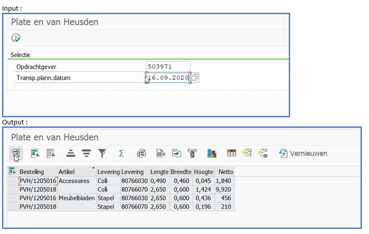 I have a transaction ZPLAHEU with a input and a output like under: