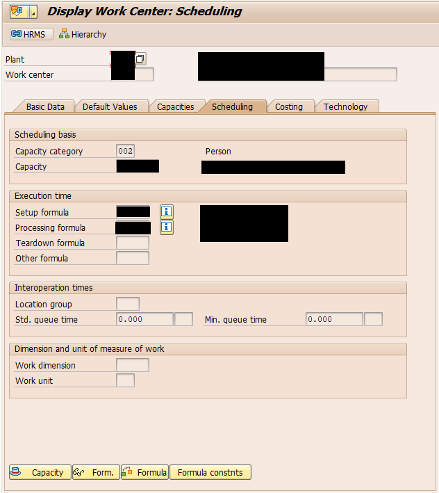 - Query 2: Work center capacity and scheduling, applying formulas for looking up he description of the formula "code"