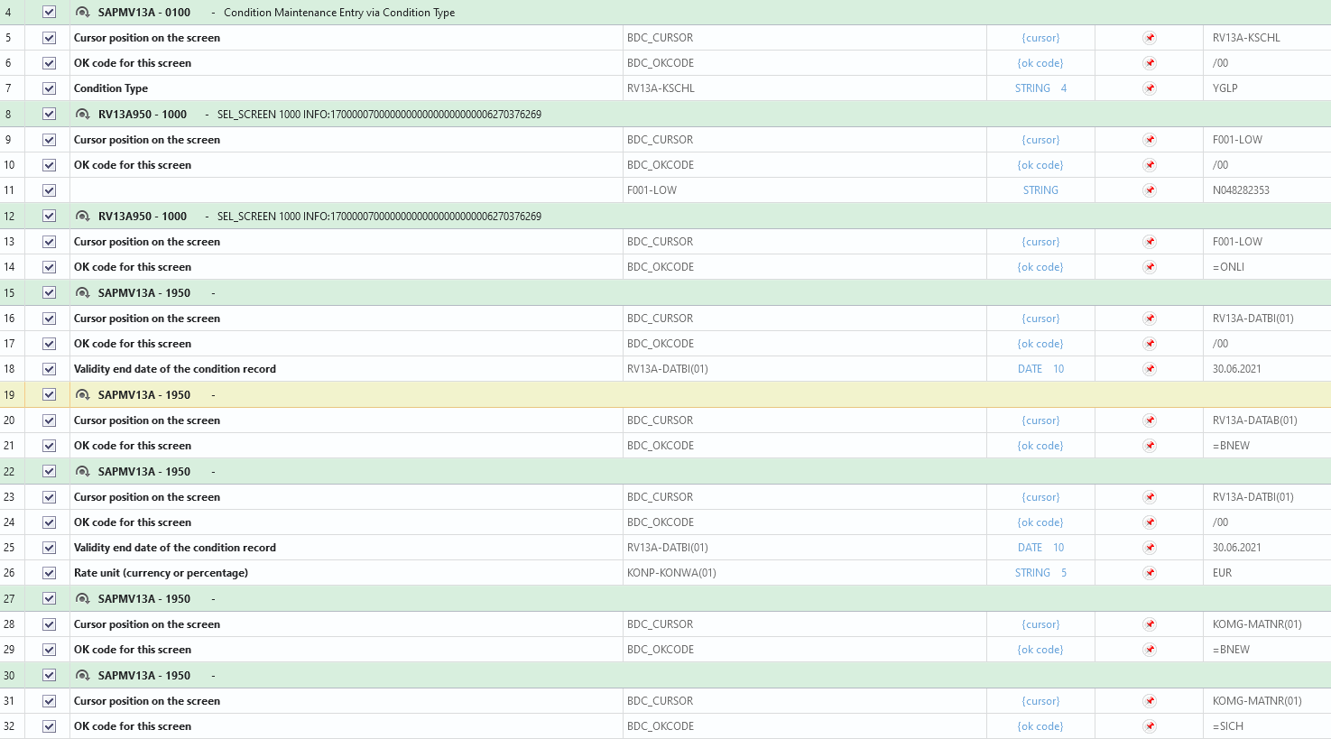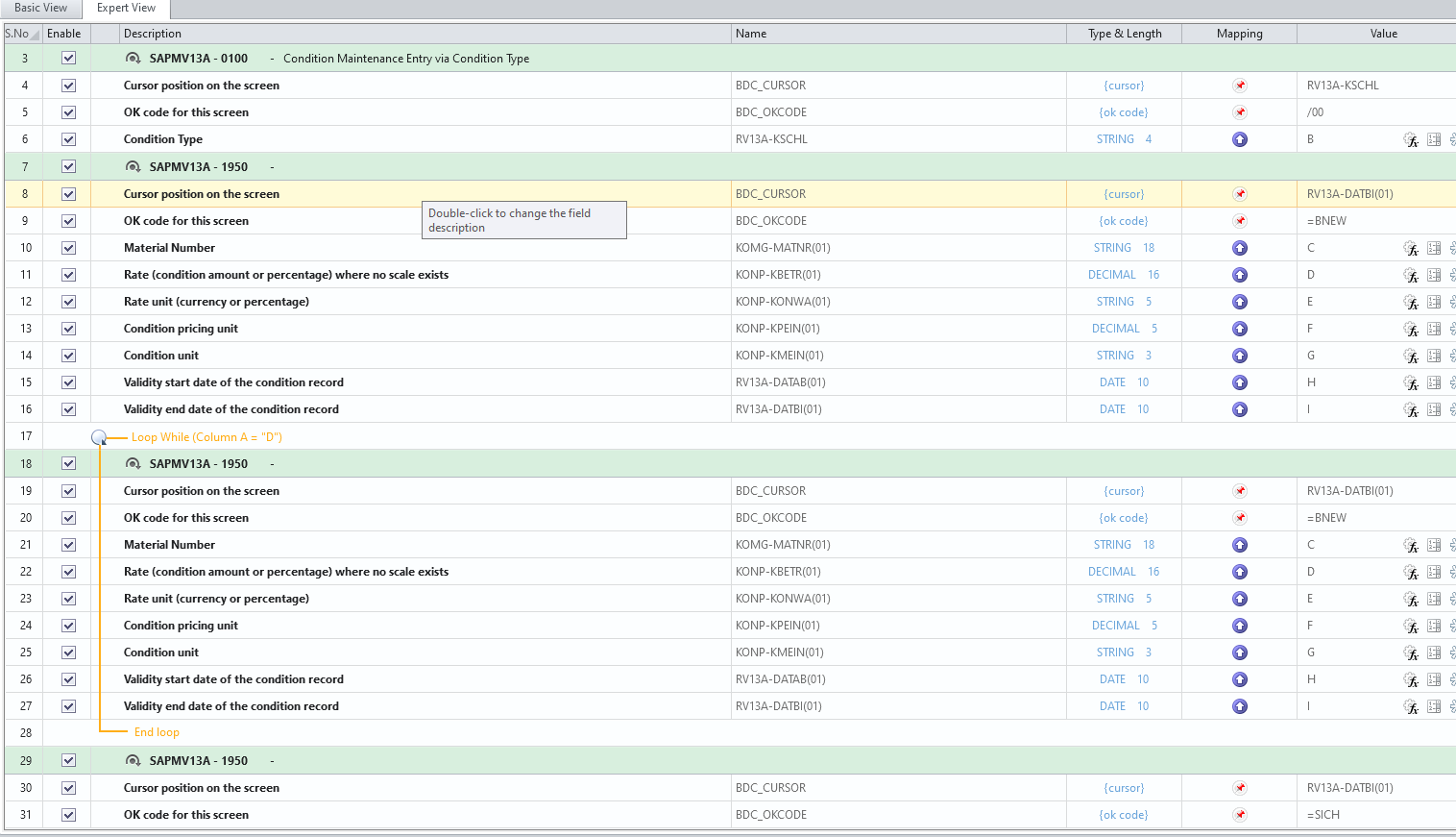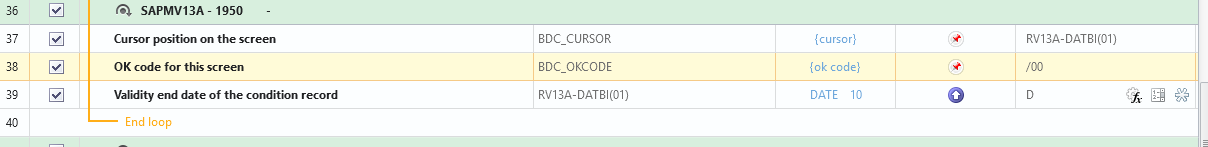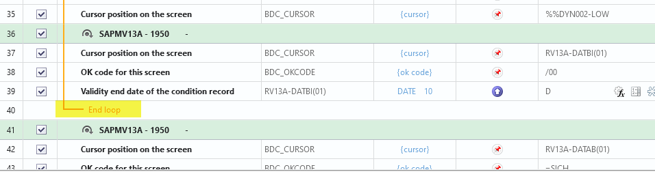 For some reason i am not being able to use loop in order to change existing condition record. I am particularly using the t-code to set expiration for a condition, in this case "price validity". I am able to do it without using loop but since my list can get crazy big sometimes, i need to use loop to speed up the process.