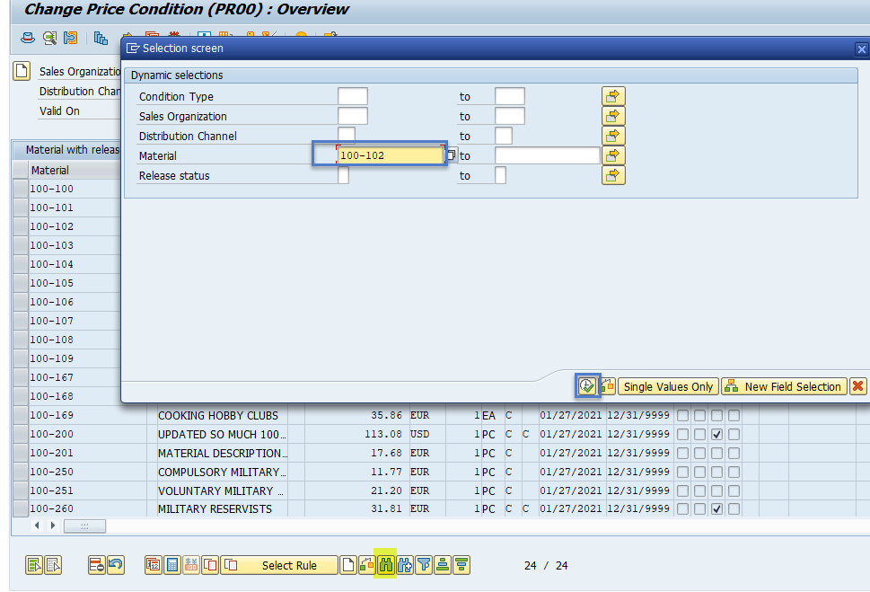 Thank you for the response. I tried the method, but i think having almost xxxxxx digit line level items in the pricelist record, i will have to put material in the either in the initial selection screen of the condition or as mass copy paste. That put me in a bit difficult position again. I tried to run without any materials, but it seems like it takes forever to load as it seems to run the whole pricelist.