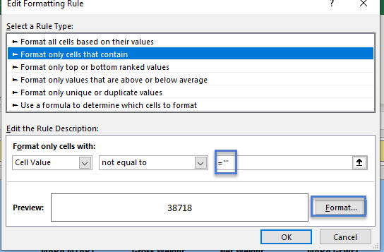 If the value is not blank - when you first create the rule, Excel will add double quotes, so I had to go back in and ensure it was just "" not """"""