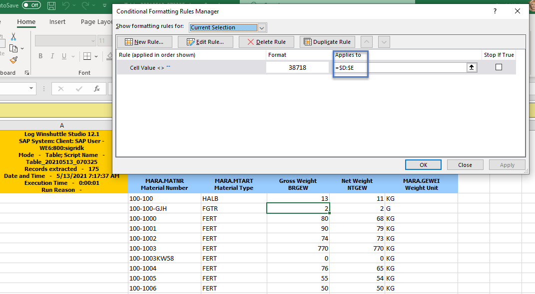 I'm applying the Excel conditional formatting rule to all of column D and E (you see the results of this rule in the excel part of this screen shot)