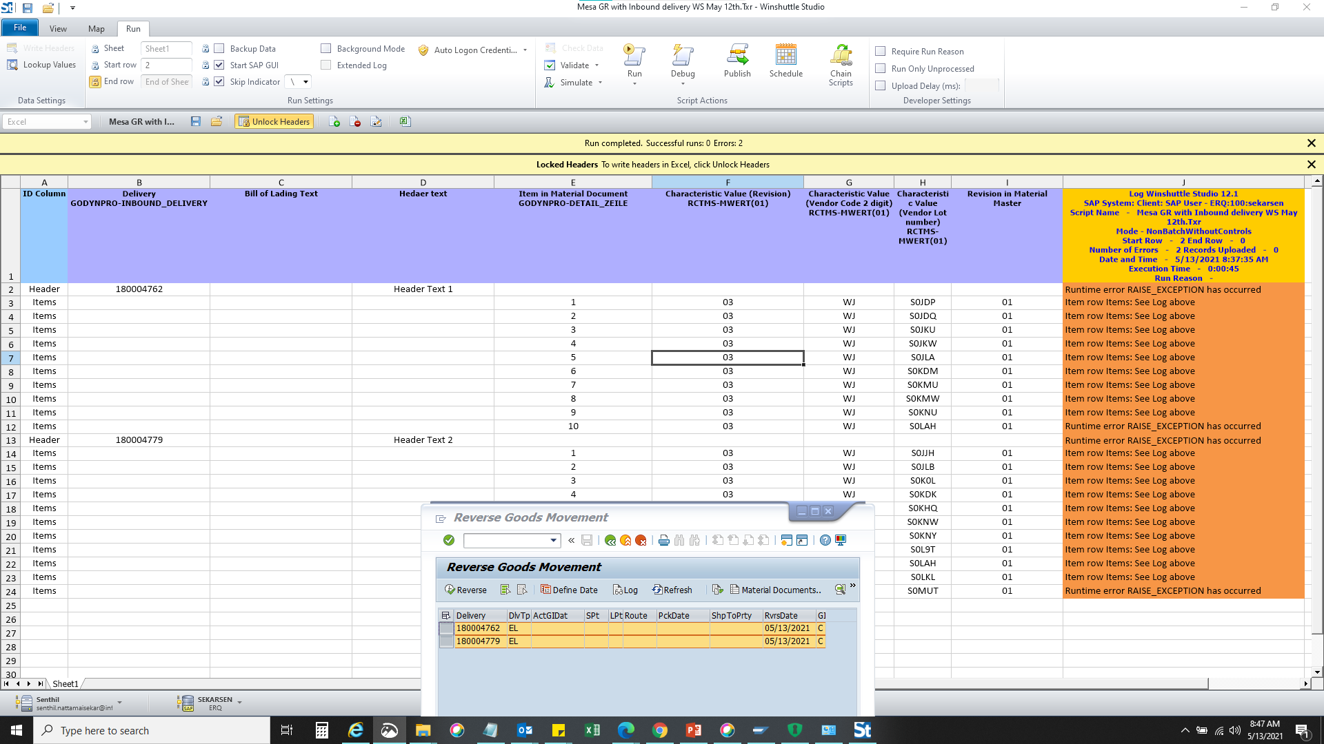 I have created a script for MIGO_GR(using WS studio version 12) this is for process where GR is done with reference to inbound delivery since each line has unique batch where Business user needs to capture few batch characteristic per batch it was decided to automate using Winstulle script. But the script does not work consistently for me, although the document gets posted it keeps giving me the error "Runtime error RAISE_EXCEPTION has occurred". I tried below things but it doesn't fix the issue and same the face issues with all these options,