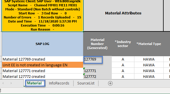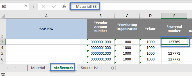 In the InfoRecords sheet, I use an Excel Formula to pull in the material number: =Material!B3 that's: Sheetname!Cell