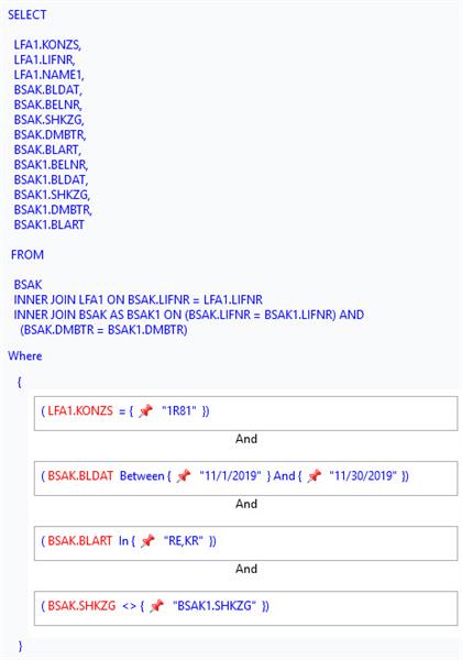 In the criteria, how can I get BSAK.SHKZG <> BSAK1.SHKZG to execute.