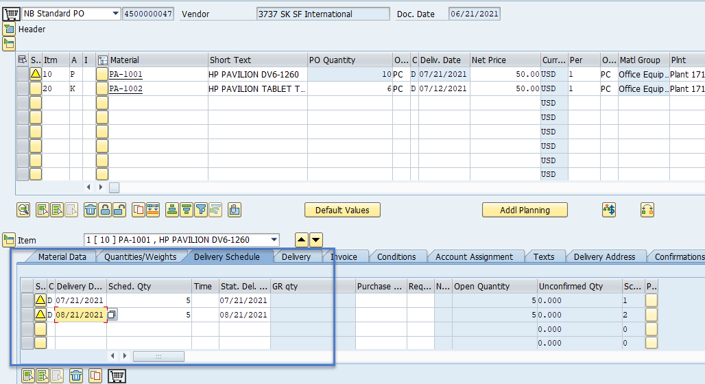 Please look at the schedule lines, Frank. It's likely the delivery is split, thus one row for each.