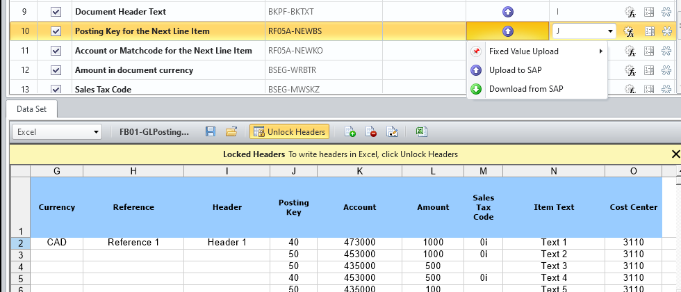 In my example with FB01, I have mapped posting key to column J.