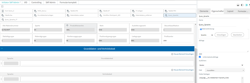 Hello Sigrid Many thanks for your help. Now it's works in the repeating table "extending plants" the query runs when the item number is created. NEW PROBLEM J I want to do it now in the same way for the longtexts. I have 2 longtext. 1. Grunddatentext (sorry this is in German) 2. Vertriebstext Boths works in the same way. I would like to define 4 rows for 4 languages. When the user wants to create a longtext he have to do it in 4 languages mandatory. Now I have a query for the 4 languages codes. The query runs when the forms starts. And it fills the language code automatically in the rows of the text. It works for the first text. But not for the second one. I have now 2 queries (different names same content = languages codes). You can see it on the pictures. The codes for the first text comes accurately. But not for the second text.  Freundliche Grüsse Jana Kuschmierz Leiterin Verkaufsinnendienst
