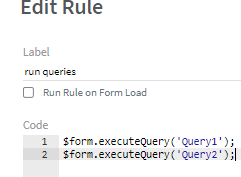Hi Jana You can use a rule on the form view load to run one or both queries if they're not both running on load based on the query control setting. FYI Sigrid ------------------------------ Sigrid Kok PSE | Winshuttle NA ------------------------------