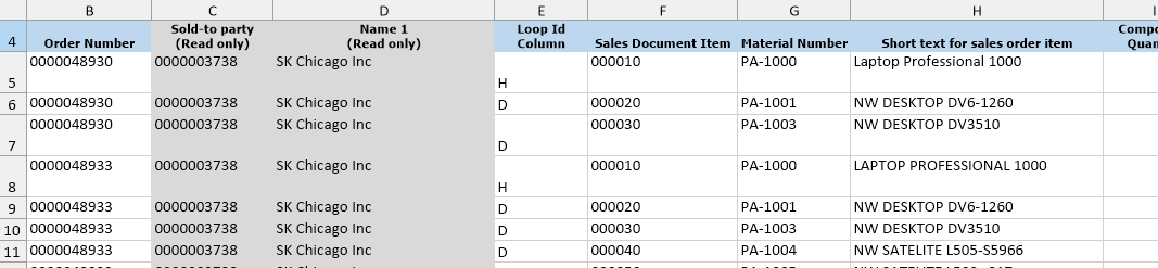 My output starts on row 5, so compare sales doc # on row 5 and compare to previous row, row 4. If different, make the loop ID column H, otherwise D