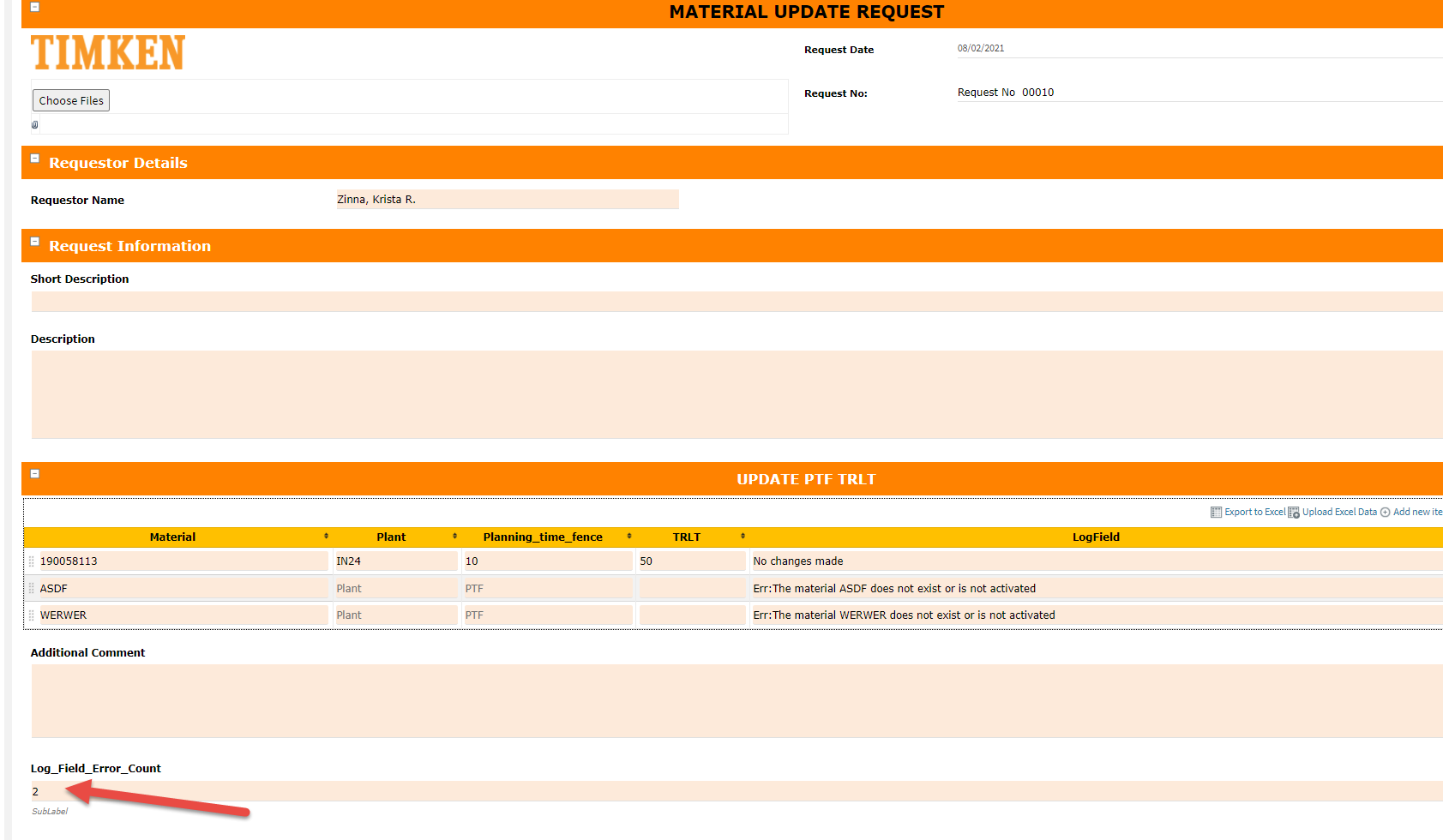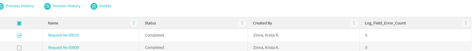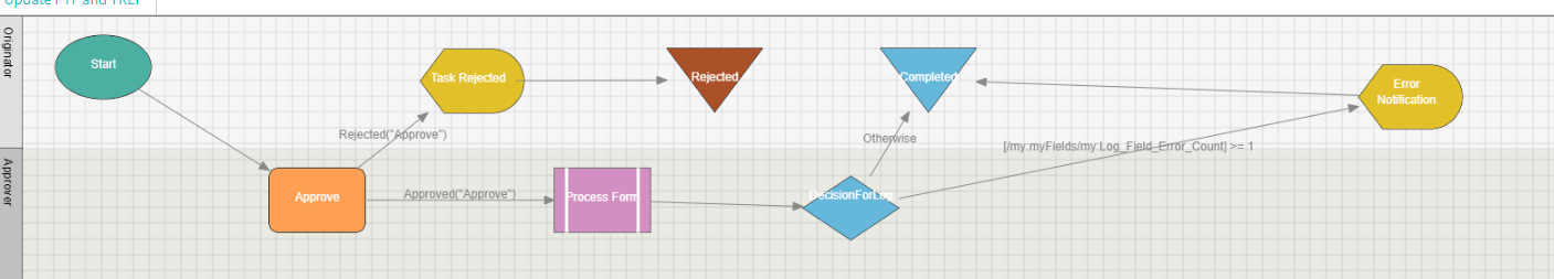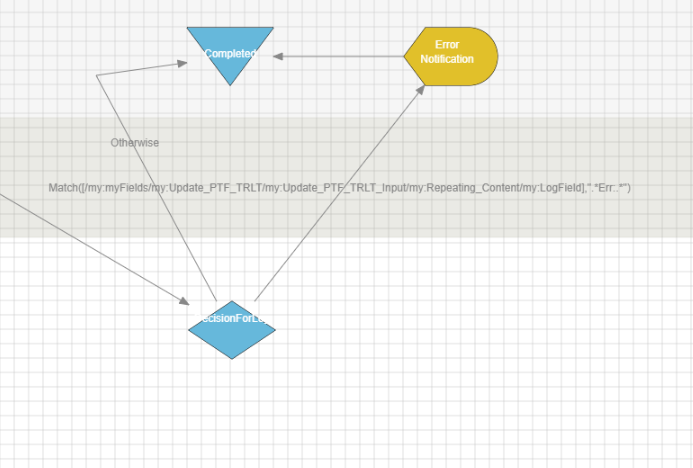 Hi Sigrid - I was able to get the Count function to work for my solution to get a field outside of my table that counts the error rows. Now I am stuck on how to incorporate this into the workflow. Here is what I have below. After the update runs with the Process Form plug in, there is a decision with an otherwise transition and a transition that is [/my:myFields/my:Log_Field_Error_Count] >= 1. This would lead the workflow to an error notification. I've tried promoting the field to a Solution field and that doesn't seem to work. I've also tried putting a Wait Plug In between the Process Form and Decision node, thinking maybe some time was needed to update the Error Count, however this is still not working. Is my formula wrong ? The Error Count field is calculating correctly but my condition/transition does not seem to be recognizing that it is met.