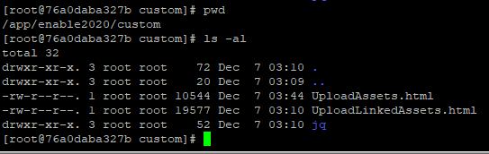The directory /app/enable2020/custom in the web-server may need to be created in the web-server container. I have copied the files needed for the Upload Assets widget and Upload and Link Assets custom action: