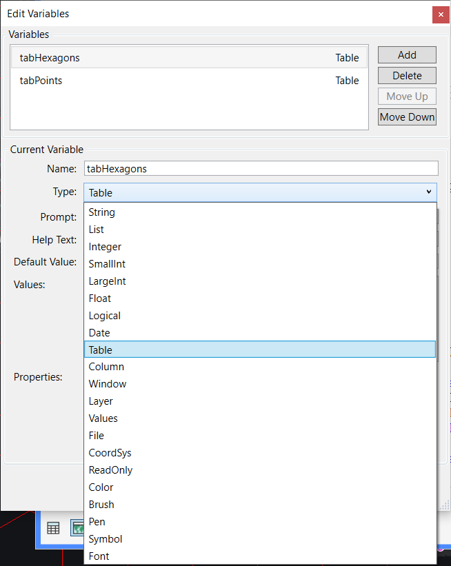 The type of variable here is Table. This will let the user pick from all the currently open tables. But I have decided to help the user a bit. I have limited the tables shown in the list to those where the dominant object type is polygons (4) for my tabHexagons variable and points (2) for my tabPoints variable. That's the condition you see in the field Values. You can use this to control the list of tables shown. Often you will do this using one or more expressions using the TableInfo() function as below.