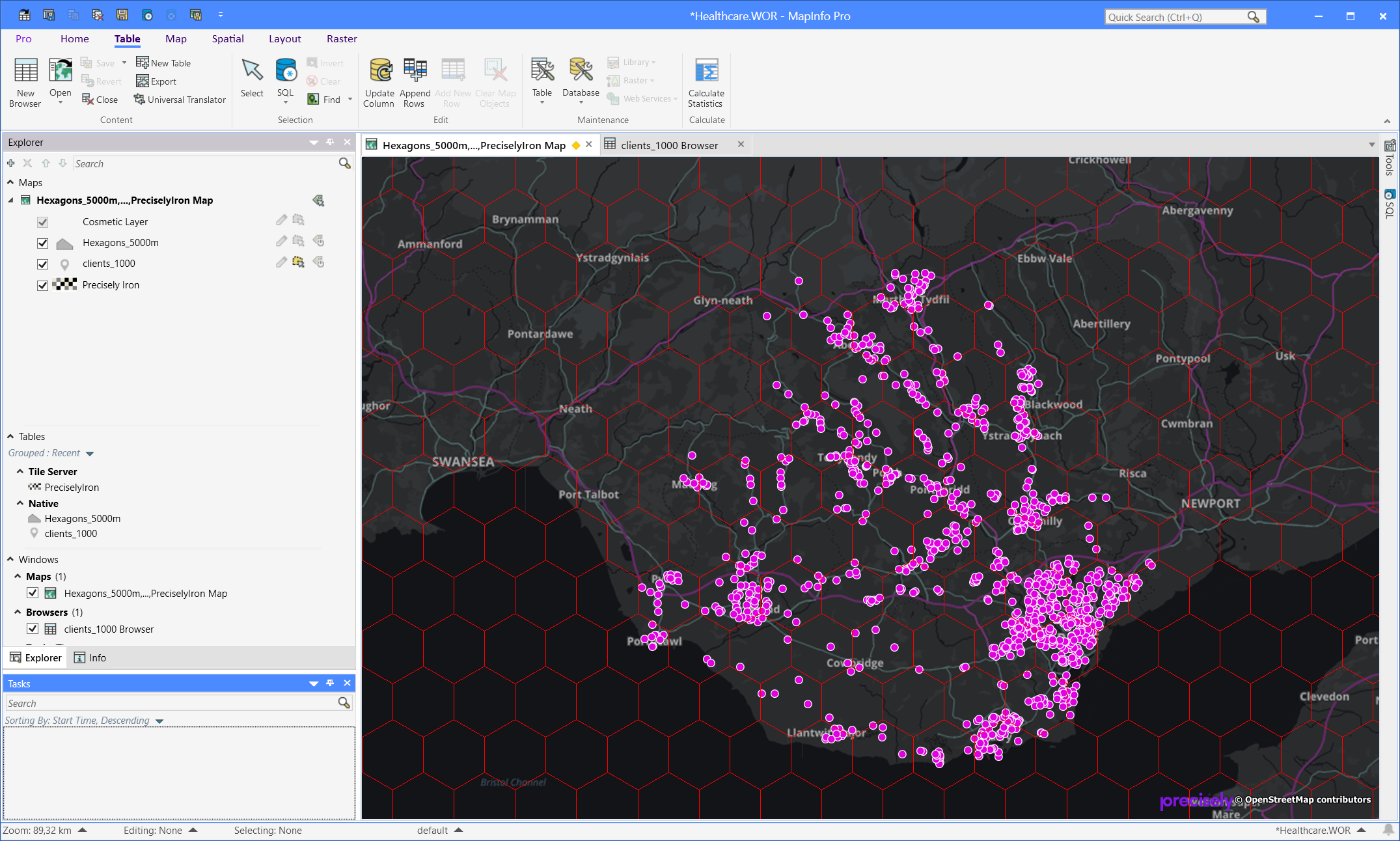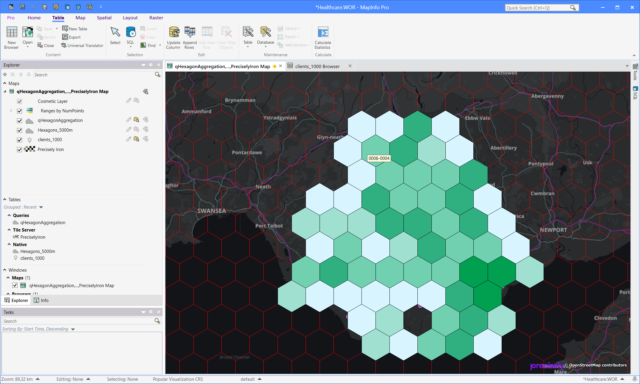 And on the right side you can see the SQL Window with my script. The script uses a Select statement to join the two tables, the resulting query is then added to my map and the script creates a thematic layer based on the calculated number of points inside each hexagon. I have used MapInfo Pro to build the statements and then copied them from the MapBasic window.