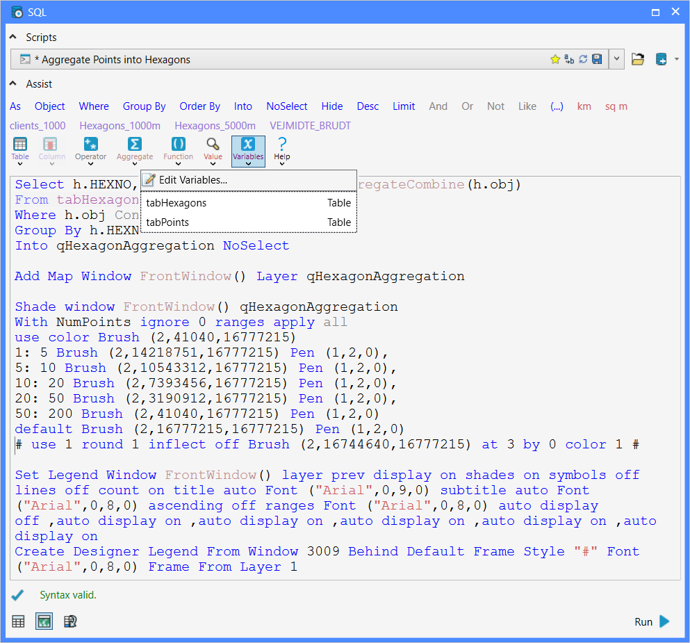 In this example, I have two tables: one with points, and another with polygons, here hexagons. I want to count the number of points inside each polygon/hexagon and create a thematic map based on these numbers. I can do this using Update Column and then create my thematic using the Add Theme option. But if I need to do this often, I can create a small script that wraps it all into one process. As the name of the two tables might change, I'll ask the user to select the two tables to use. That's where the variables come into play.