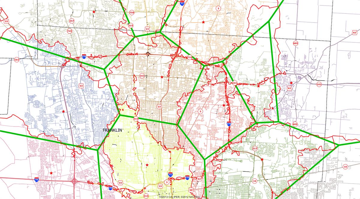 It is useful for dividing areas of responsibilities for field offices or possibly postal zones. It can also be used as a simple way to divide your sales territory into smaller sales districts where you assign each dealer the area that is closest to that dealer.