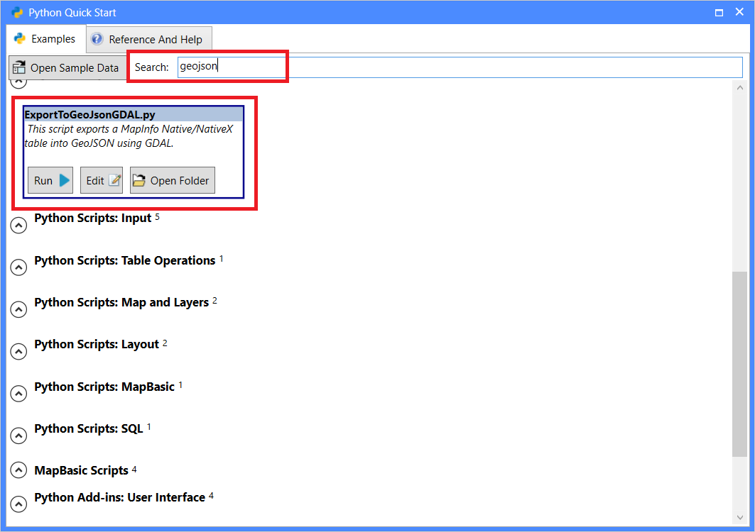 Now click on the Run button for the ExportToGeoJsonGDAL.py sample.