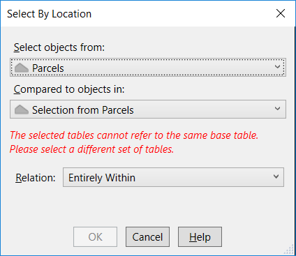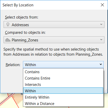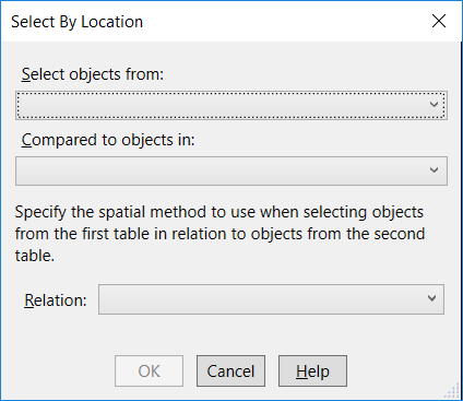 If you have selected one or multiple records before accessing the Select By Location dialog, the Compared to objects in dropdown will be prefilled with the selection. The dialog assumes that you want to use the selected objects to find objects in another table.