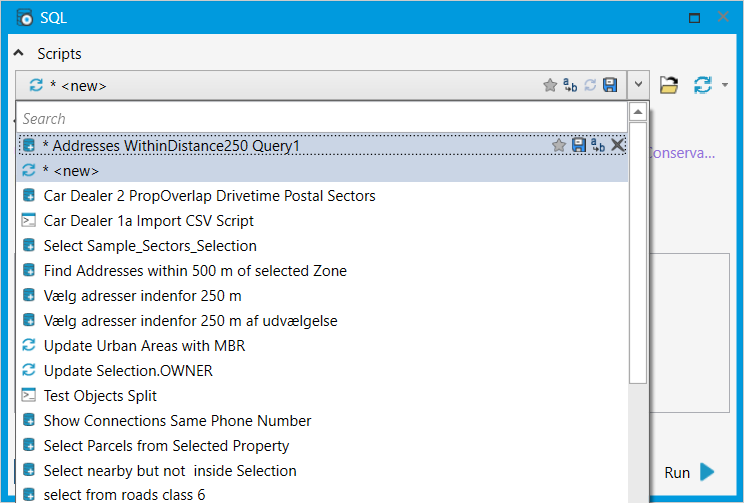 You can, however, also access the query in the new SQL Window. You can find the Select statement in the Scripts dropdown at the top of the window. The statement will be named using the two tables and the spatial relation used. You can select it from the dropdown, and then edit and rerun it from the SQL Window.
