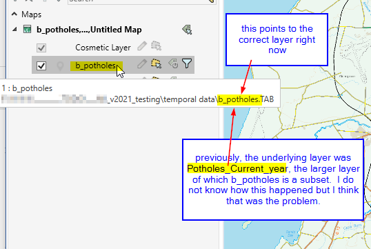 This is how MapInfo Pro controls which records to display for a given time period. The Layer Filter gets updated when your switch to a different time period.