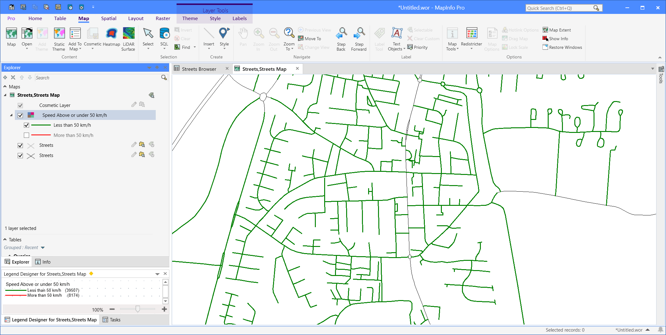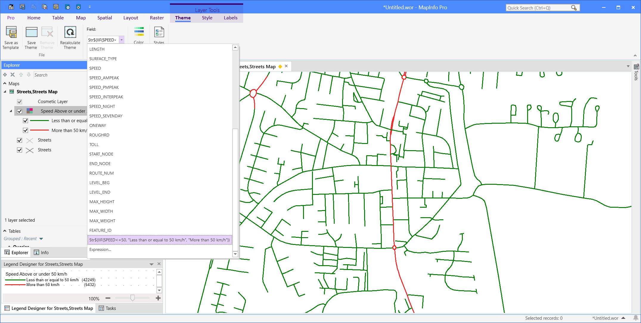 Explorer window to turn off the visibility of the roads that have a speed higher than 50 km/h. Also, note that I have renamed the thematic layer to show the condition in a more natural language version.