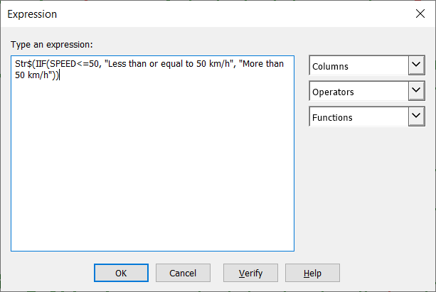 Str$(IIF(SPEED<=50, "Less than or equal to 50 km/h", "More than 50 km/h"))