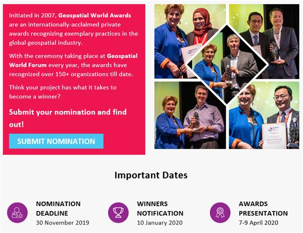 • 1.  Geospatial World Awards 2020 - get recognized for your work