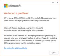 The upgrade installed MS Access 2016 64-Bit dbEngine and now I'm unable to open any MS-Access db with MS Access, - and MS Access doesn't start as well.