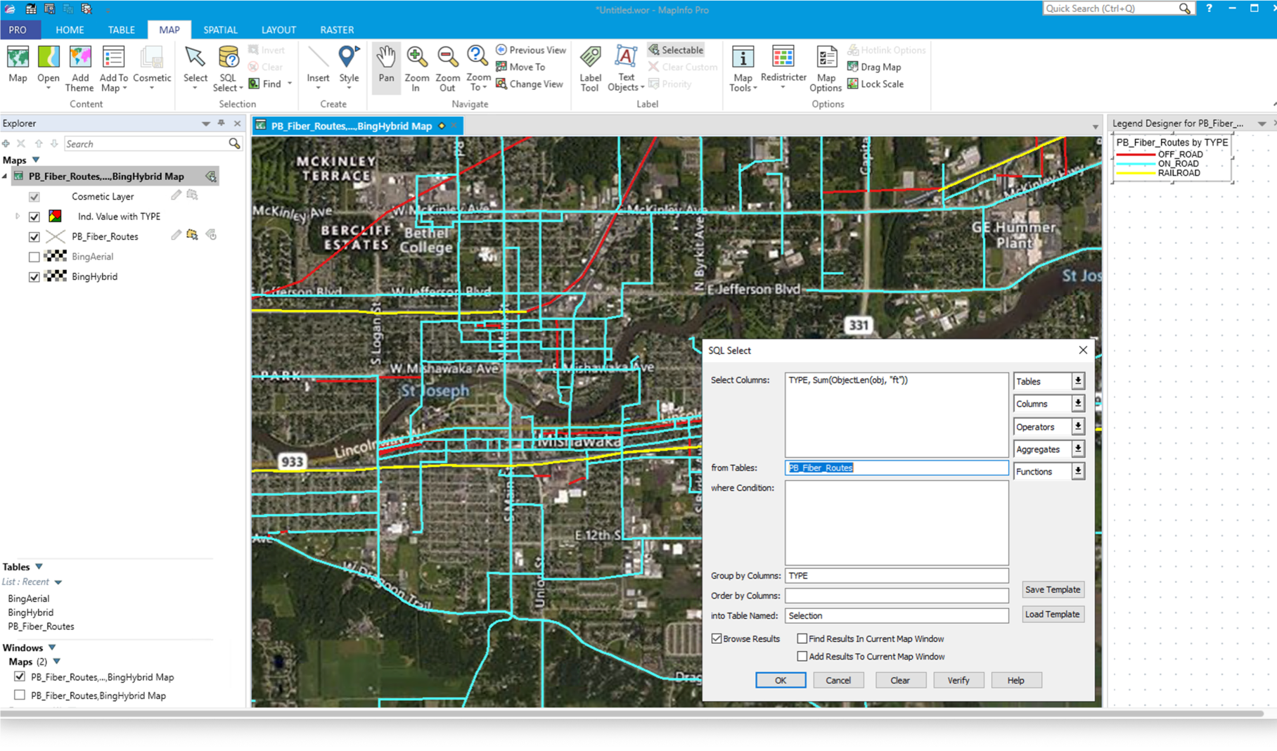 In mapinfo pro 11.3 I am looking to use the SQL Select and extract total road lengths. I need to say use a table named 'highway' and then select from the different hierarchy of road (A, B, C, U) and then add up all the lengths from each section with total lengths. Do you have any ideal what type of syntax I could use within the 'where condition' box? Thank you for any assistance on this. I was going to post a message on the forum but I couldn't find anywhere to write a new post.