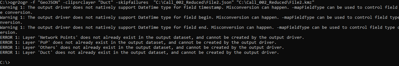 ogr2ogr -f "GeoJSON" -clipsrclayer "Duct" -skipfailures "C:\Test\File2.json" "C:\Test\File2.kmz"