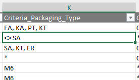 So for instance: when searching for label data to packaging type "SA", the query must consider all rows in the reference data list where packaging type contains "SA" and (!) ignore those rows where this packaging type explicitly is excluded by "<>SA".