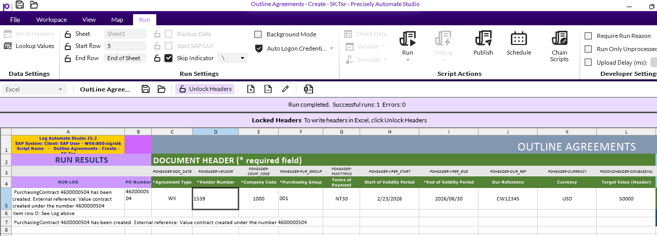 When I did that, I was able to run your script with a standard value contract and my vendor, purch org (which was hard coded) and materials.