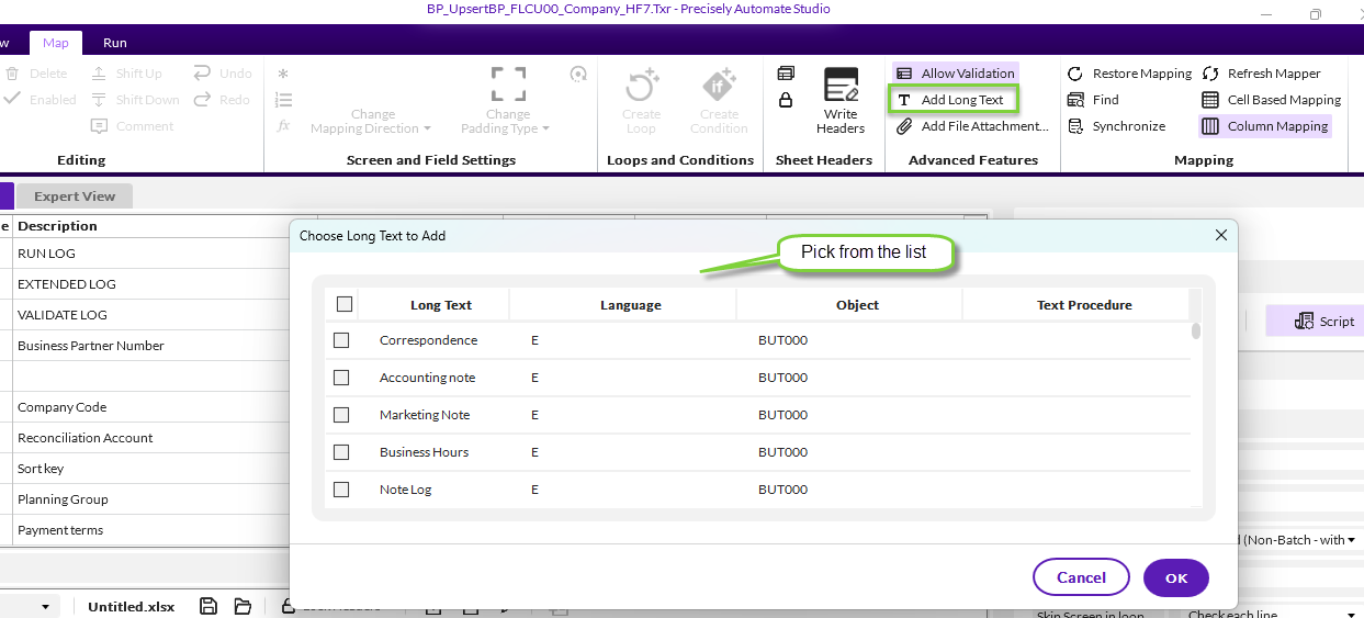 In Studio, just record opening a BP and then close it (unless you are uploading more data). Then on the Map tab you can add it. The list may vary based on your system depending on which long text options you have configured in your SAP system: