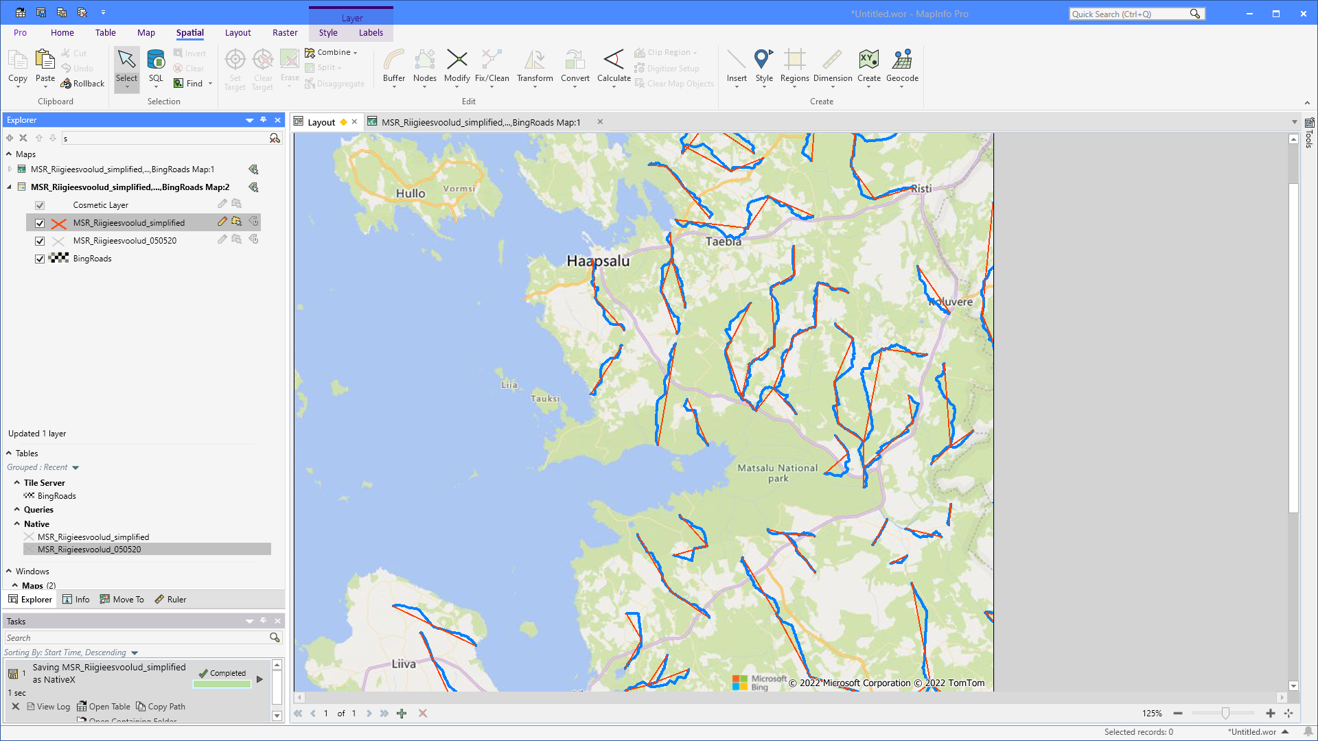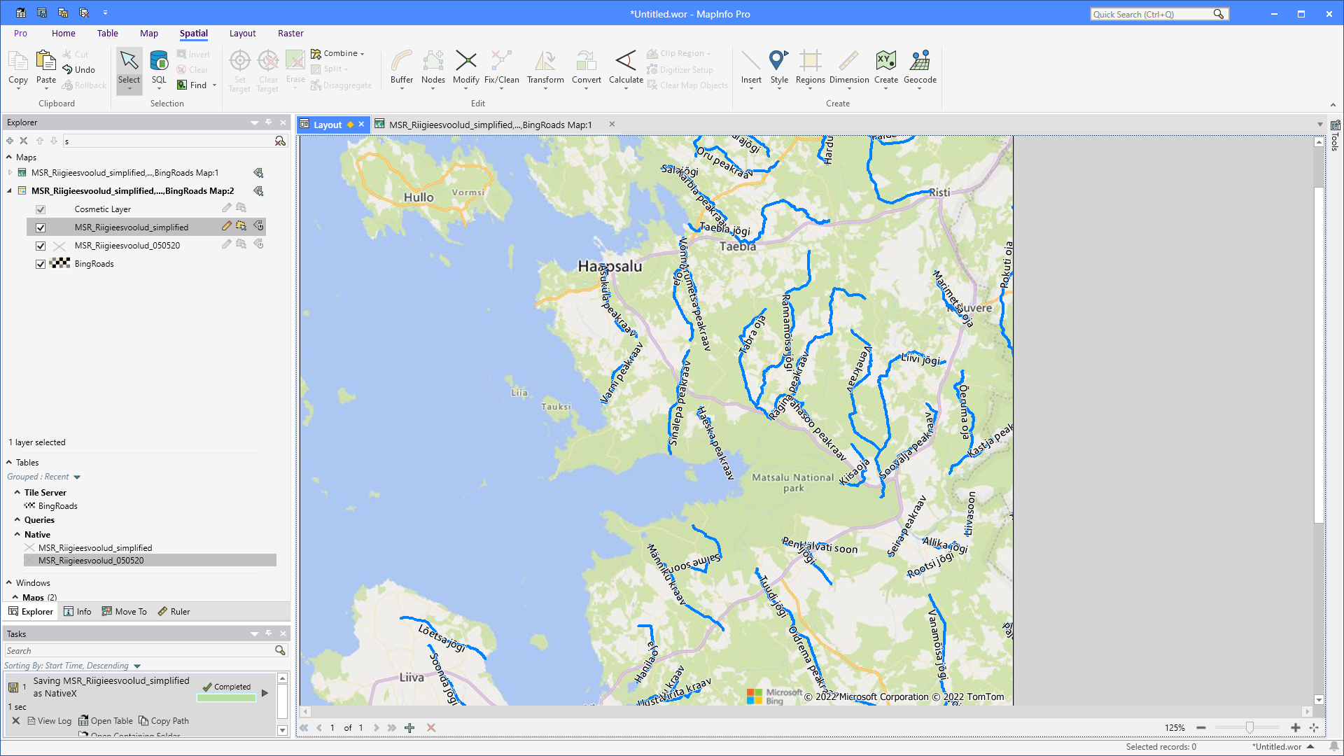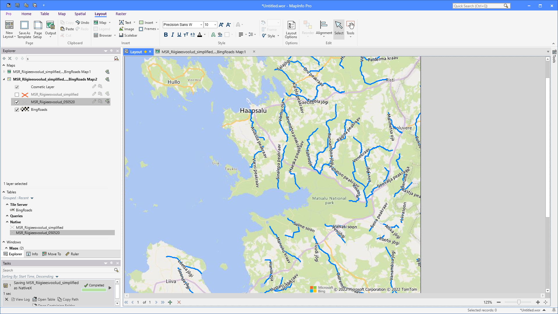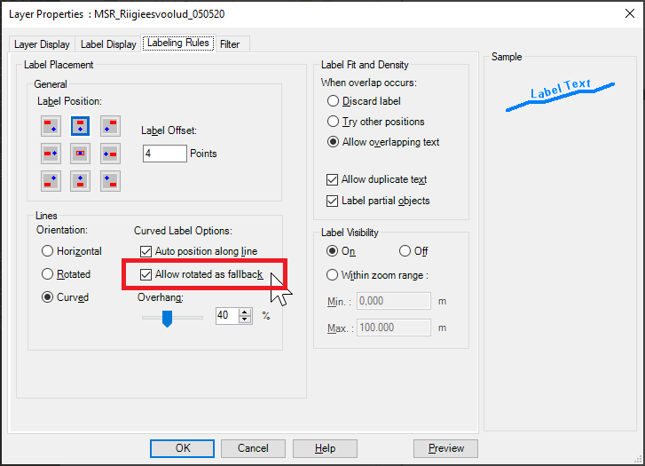MapInfo Pro Version 2021.1 Release build 25. I wonder why some labels won't show (Missing_name.png) when I use "Curved" setting (Label_properties.png). Layer has first priority (Label_priority.png). Labeled layer is MSR_Riigieesvoolud_050520 ("MSR_Riigieesvoolud_050520.zip) and labeled field is "EHITISE_NIMI" (Labeled_field.png). (I have 175 layouts to make and every layout needs to have MSR_Riigieesvoolud_050520 "EHITISE_NIMI" (basically river name) for every MSR_Riigieesvoolud_050520 object (basically every river)).