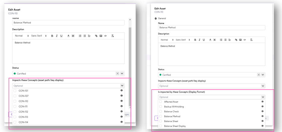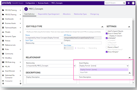 When adding relationships to an asset via the Relationship field type there is an option now to show either the asset path (key fields) or the asset type display format. This allows for a user- friendly name to be shown when selecting a relationship when the key field is an ID field.