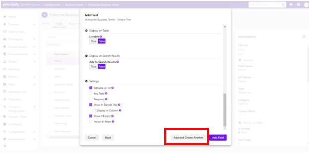 In addition, the option to "Add and Create Another" has been added to speed in the creation of multiple fields at one time.