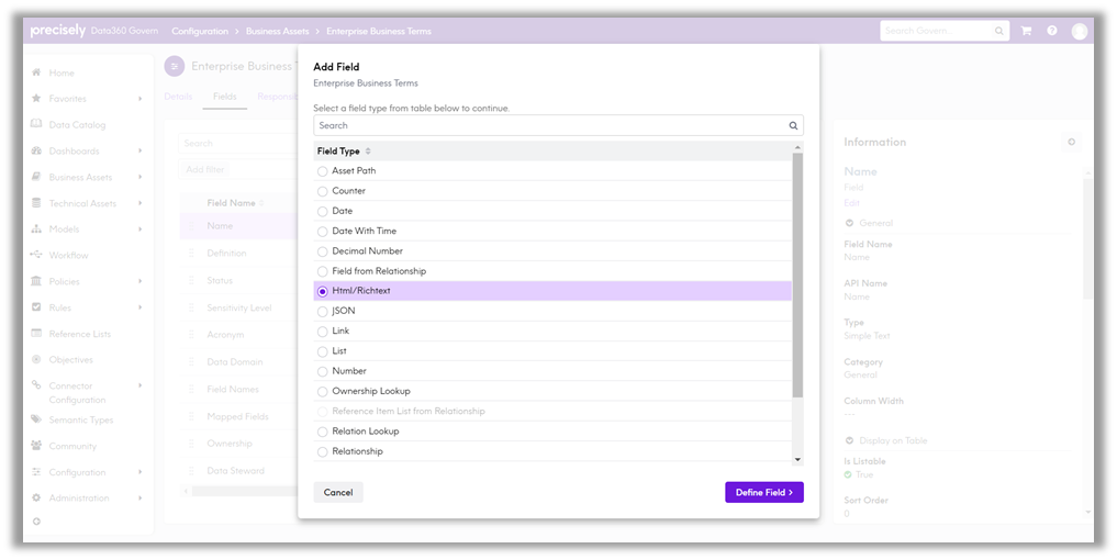Adding a field to any Asset Type is moving to a modal. The process has been updated so that the field type will be selected before the name and settings are defined. This streamlines the effort by making sure only the necessary required and optional fields are displayed.
