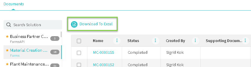 Am not sure what version you are on. Am on 20.2.2 right now, and there is an option to export the list of documents for a solution to excel