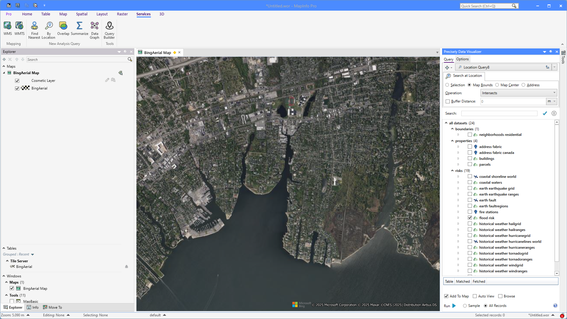 In MapInfo Pro, I have opened a base map in the form of Bing Aerial, which gives me a good amount of details. I have zoomed to a location near Great South Bay on Long Island, USA.