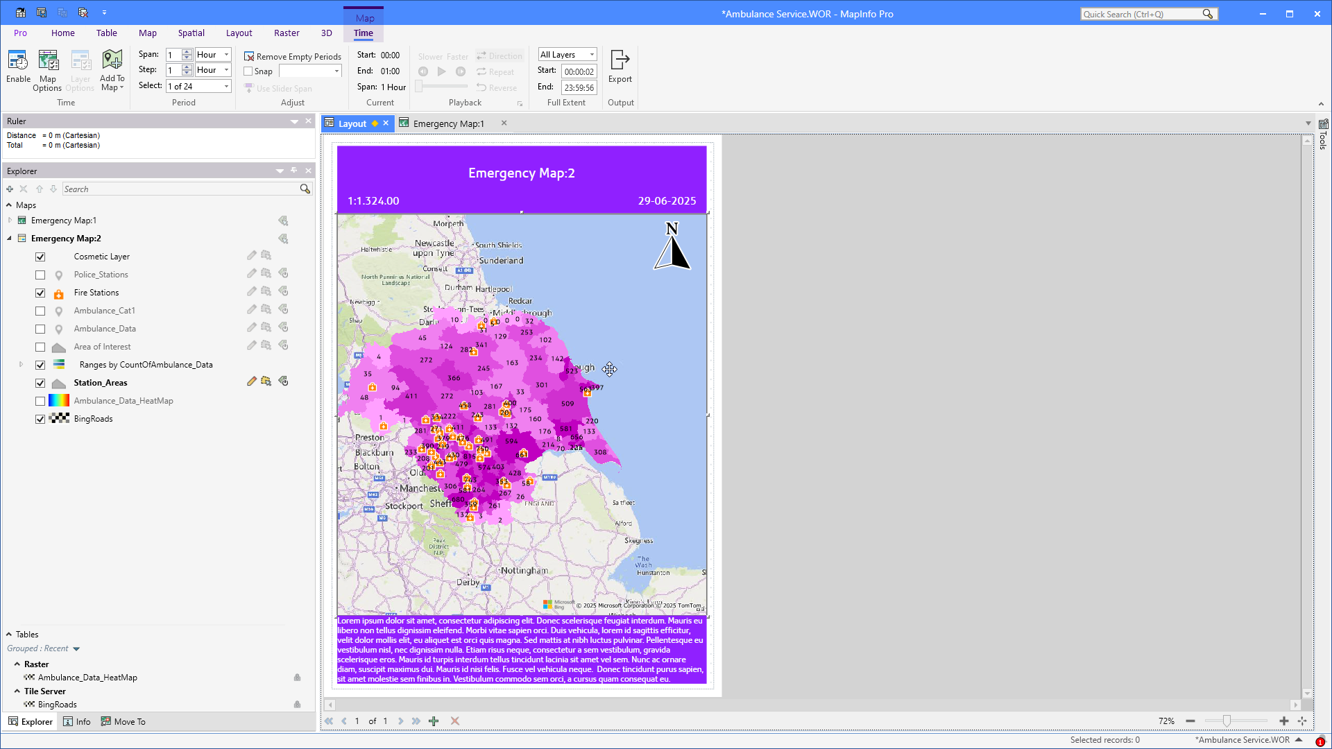 MapInfo Pro will now open the layout stored in the layout template and populate the placeholders with the maps, browsers, and legends.