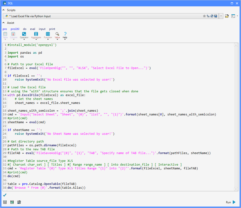 MapInfo Pro comes with Pandas preinstalled. However, you must install the openpyxl module yourself to use it in MapInfo Pro. To do so, launch MapInfo Pro with elevated rights by right-clicking on the shortcut and selecting Run as Administrator.