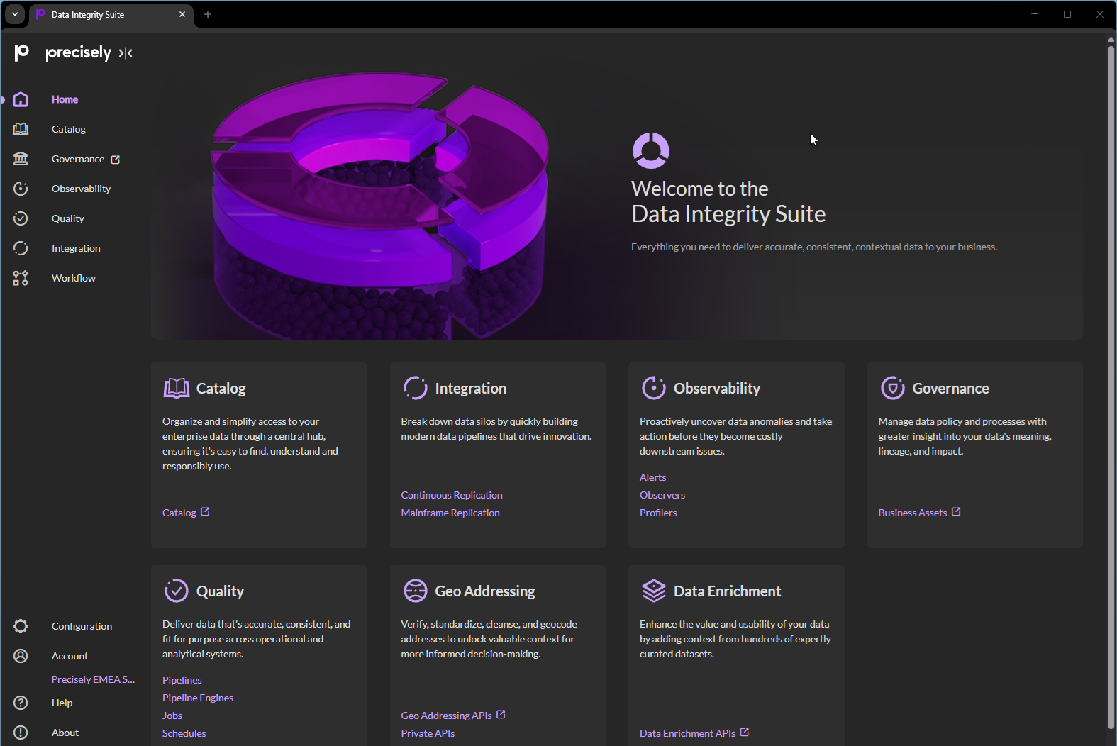 At Precisely, we are focused on helping organizations make confident decisions that are based on accurate, consistent, and contextual data. That's why over the recent years, we have been building the Data Integrity Suite, a set of interoperable cloud services that enable your business to build trust in its data.