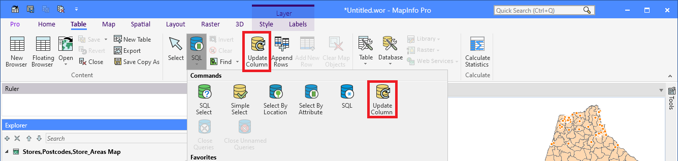 You can find the Update Column control from the SQL dropdown on the Table, Map, and Spatial tabs. On the Table tab, the Update Column control can also be found directly in the Edit group.