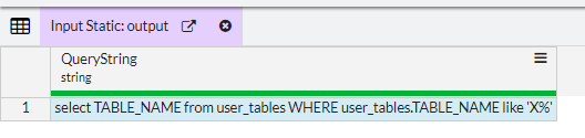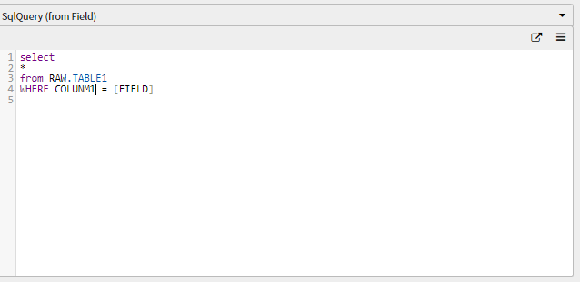 However, you can alternatively use SQL Query Field Bindings to create a dynamic SQL statement that is to be executed by the node. In this case, the base SQL query is defined as a literal string in the JDBC Query node but the element(s) to be sourced from an input field(s) are represented by the "?" character. For instance, the modified SqlQueryField value is as follows: